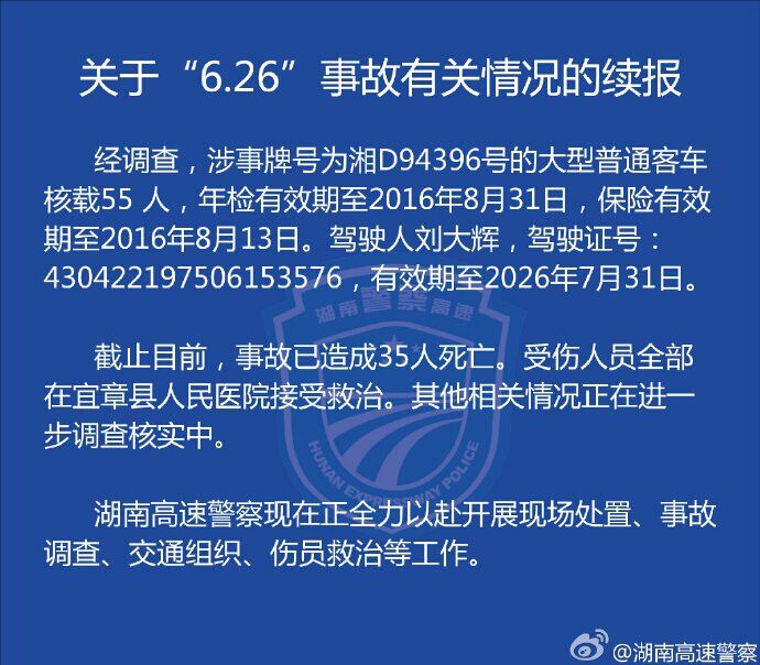 经省高警局调查,涉事牌号为湘D94396号的大型普通客车核载55 人,年检有效期至2016年8月31日,保险有效期至2016年8月13日。驾驶人刘大辉,驾驶证号:430422197506153576,有效期至2026年7月31日。
