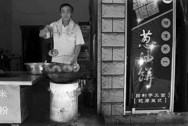 平政路414号食全食美饮食店的阎鲁湘,1952年8月出生,土生土长的平政路人,外号“油饼”。1989年在关圣殿附近的私产房开了个“鲁湘油饼店”,2004年配合政府整治环境拆迁又搬到新生码头继续营业,今年3月又租了现在这个地方继续经营他的美食。阎鲁湘是1987年从湘潭市第一建筑公司下岗的,他先是在平政路一带做点夜宵生意,后来从师六十年代非常有名的周志南老师学习炸葱油饼,传承和发扬湘潭老字号品牌。现在食全食美的葱油饼号称湘潭第一饼,且远近闻名。