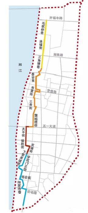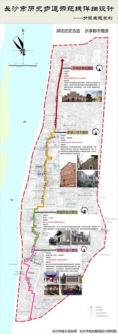 从战国时期开始,从毛家桥巷到省立一师范这块区域便是古长沙的中心城区,三六九等的人们生活于此,城区不同部分各有不同功能。此次历史步道建设,也根据各段历史特色的不同,分别打造千年古刹、教堂公馆、湖湘民俗和书院文庙四个主题段。