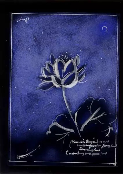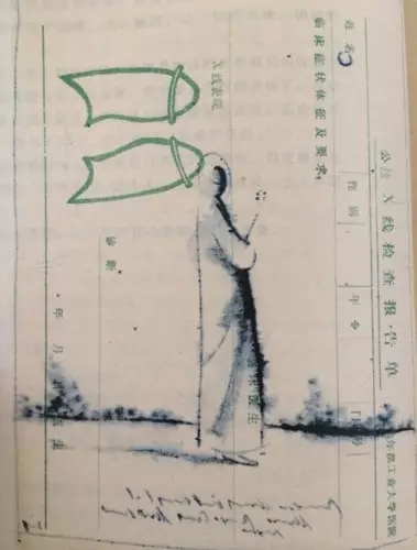 那会儿,我正迷醉于自己的一套神奇“发明”之中。为了追求某种水墨效果以及想在画面上表现出木口木刻的“刀口”味道,我使用了一种刺激性极强的腐蚀液。黄澄澄的药水,被棉签均匀涂抹在事先用蓝墨水处理过的处方上,阿摩尼亚气味儿迅速弥漫开来,画面上那靛蓝色的天空,慢慢浮现出“落日熔金,暮云合壁”的奇幻效果。那当儿,一定觉得自己像爱迪生。一张画下来,每每弄得鼻塞喉痒,泪流满面。我知道,那是因为体内组织胺(histamine)大量分泌的结果,医学上称之为“速发型变态反应”。我往往会推开窗子,让夜晚的凉风(多半值夜班时作画)为我那因为激动而充血发烫的面颊降降温。我对自己无意中 “发明”的这套奇技淫巧,颇为得意,常常拿来炫示于人。这样做的目的,也不过是为了博其一句半句的嘉许!如今想来,那会儿真是轻浮得可以,也可怜得可以。我是个简单的人,当初做出那样夸张的举动,也不奇怪。