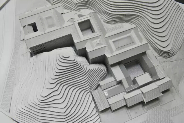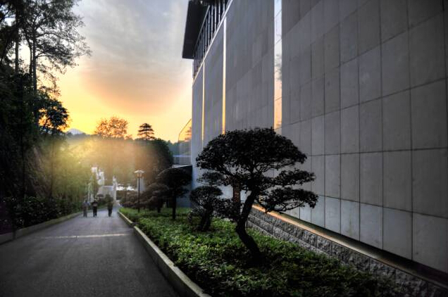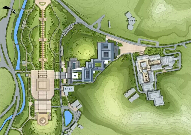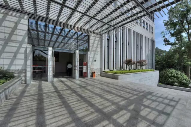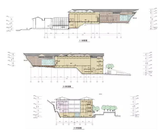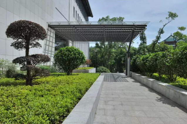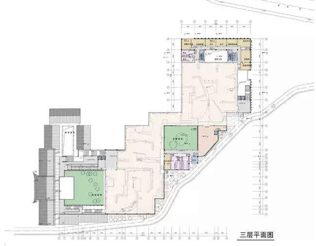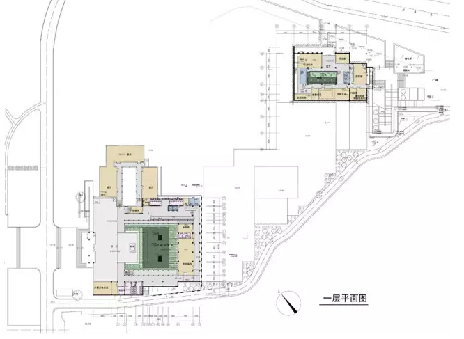 同时,在展厅北端利用主展厅与新建东广场之间的高差并围绕保留的树木,设置四层办公管理建筑,临韶峰路设置出入口,既有效的利用了空间高差,又加强了纪念馆、遗物馆之间的联系和管理。