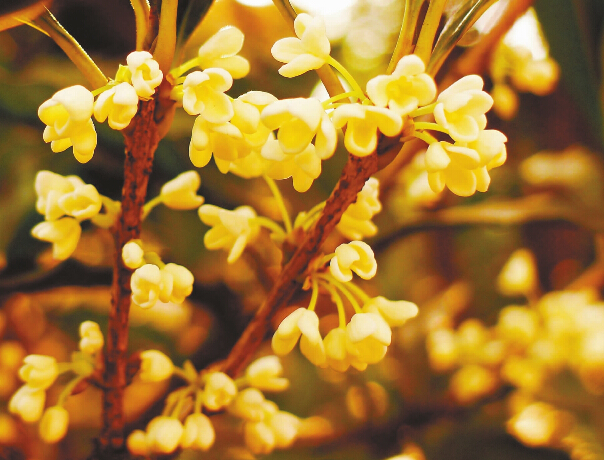 秋真是位多情的诗人,而且把爱秋的人们也变成了诗人,初秋那满山的七彩令人入了童话世界似的,忍不住要在橙红蓝绿中嘻戏欢舞,隔一阵那金黄的田野,沉甸甸的果实又让你充满喜悦而情不自禁大唱赞歌。今天上午还在为落叶飘零而暗自伤感,现又为桂花飘香而激情昂然。看着桂树上清秀可人的小花朵,不由想起李清照的《鹧鸪天》“暗淡轻黄体性柔,情疏迹远只香留。何须浅碧深红色,自是花中第一流。人可煞无情思,何事当年不见收。”此诗表达了作者对桂花色淡香浓的赞赏,对屈原的《离骚》遍收名花珍卉、唯独未列桂花于其中而鸣不平,说这位先贤是情思不足。我想这位先贤并不是情思不足,许是身旁并没桂树,即使有也可能没醉于过桂花清沁肺腑的芳香。桂树开花时间其实很短,仅中秋前后,犹如昙花盛开,很想开得更长久些,最后不得不让凋谢来注释它曾经的灿烂,桂花却是香飘十里来让人铭记它。如像我窗前也生了这么一株高大的桂花树,秋中静座窗前,自会是情思万涌的。