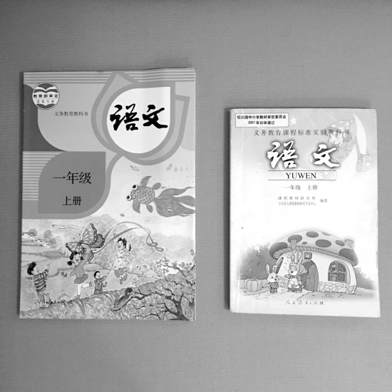 8月24日,长沙,今年开始使用的小学一年级新版语文教材(左)与旧版语文教材对比。图/记者杨旭