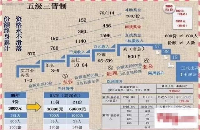 根据“1040工程”的体系规则,参加人员分为5个级别。想要成为业务员就要申购第一份“投资”,即3800元;以后每一份都是3300元;组织中包括五个级别,购买1到2份是业务员,3到9份是组长,10到60份是主任,65到500份是经理,600份及以上是老总。