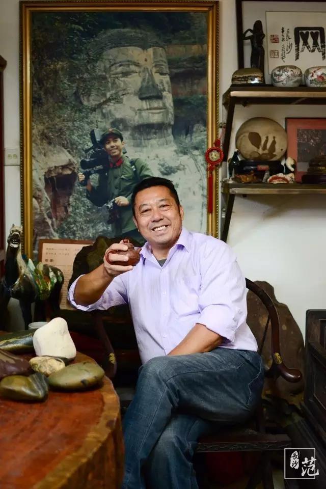 ■ 谈及与石头的结缘,王老师说源于十多年前一次偶遇。12年前,王老师从长沙一个花鸟市场外经过,看到一个店家门外堆了一大堆不甚值钱的石头,有块石头不经意跳入他的眼中,造型很是奇特,本着好玩心便将其带回了家。回家后仔细把玩才发现,石头表面上凹凹凸凸纹样很像锤子和镰刀交叉的党徽。对于党徽的自然天成,王老师很是惊叹,自那以后他留了一份心给奇石,开始了与石纠缠的一生。