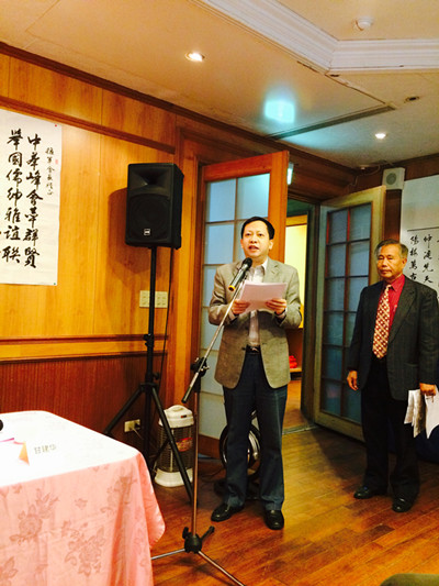 (2015年3月21日,甘建华在台北做《衡阳与台湾的文化结缘》演讲,后为大会主持人、原国军少将俞川心先生。照片由作者提供)
