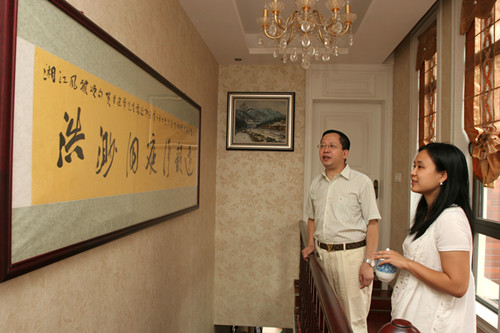 首发式宴会结束后,甘建华驱车回到华新开发区银泰红城的别墅中。准备入读澳门科技大学的甘恬,哼着歌儿为父亲开门,深红色大门徐徐掩上,也将北京荣宝斋原副总经理、书画收藏鉴赏大家米景扬题写的门楣“晴好居”,洛夫先生所书清代状元衡山彭浚撰写的门联“静观流水乐今日;好向春风怀古人”,以及何满宗亲书挂在大门右墙的一块字匾显露出来,它们都是由湖南工艺美术大师张建华在红木上镌刻的。字匾是唐代著名诗人柳宗元的诗歌《过衡山见新花开却寄弟》:“故国名园久别离,今朝楚树发南枝。晴天归路好相逐,正是峰前回雁时。”