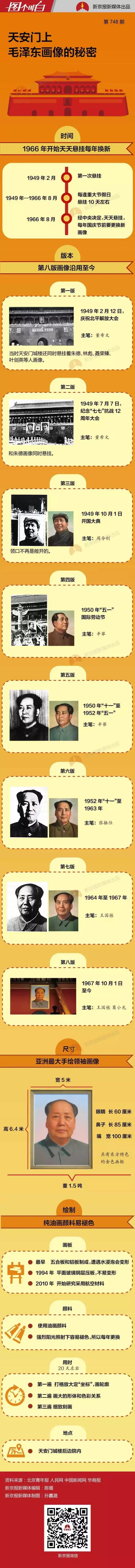 毛泽东画像最早是1949年2月出现在天安门城楼上的。当年开国大典当天出现在城楼上的画像,其实已经是第三版了。今天我们看到的这幅,是第八版。