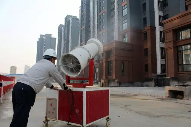 12月18日,在中建三局北京通州10片安置房项目现场,工作人员用雾炮抑制扬尘。 12月16日20时,北京市预警中心、北京市空气重污染应急指挥部办公室启动2016年首个“空气重污染红色预警”。北京市建筑工地停止土石方等施工作业,采取多举措加强扬尘治理,应对雾霾污染天气。