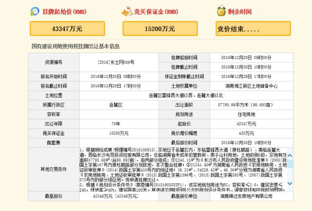 编号为[2016]长土网059号的纯住宅用地,位于岳麓区雷锋西达到以西、岳麓大道以北,出让面积57795.66平方米,出让年限70年,最终被湖南锦达房地产有限公司以43348万元,折合楼面地价2500元/平米拍得。