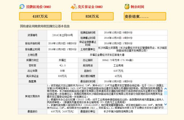 编号为[2016]长土网058号的工业用地,位于开福区金霞经济开发区新港大道,出让面积50642.73平方米,出让年限50年,最终被长沙平端冷链物流有限公司以底价4187万元拍得。