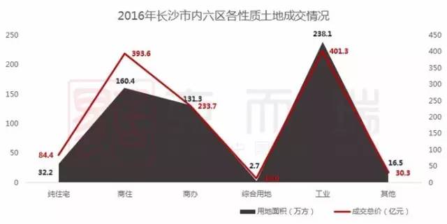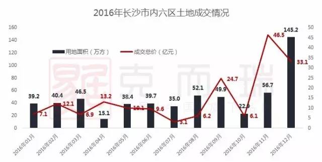 据克而瑞长沙机构统计数据显示,2016年长沙市内六区成功出让107宗土地,出让面积共计581.2万方,土地出让总金额为178.63亿元,同比分别上涨10%、37%、114%。