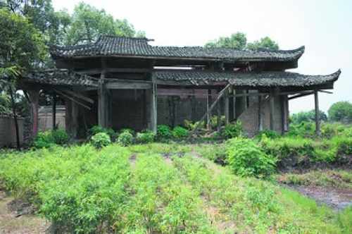 之后,我站在了一块围有竹篱笆的菜地跟前,侧边还有一口小池塘,再过去,便是老所长所说的破败的大成殿。说它破败真是不过分:约面阔五间,门窗已荡然无存,一眼就能看到大殿的青砖后墙,还有殿里立着的几排大圆木柱。我再走近,一种凄怆的气息迎面扑来,苍青的重檐屋顶已然摇摇欲坠,左边屋顶塌了个大洞,大殿地面凹凸不平,落满了破碎的青瓦,杂乱地卧了些长长短短的木头,还有一堆堆青青的杂草。当我站在大殿里,历史尘土中的陈腐的荒芜的土气便悄然袭来,还有似有似无的噼叭的破旧的声音。我摸了摸千疮百孔的木柱,一抬头便看了那残破的蓝晃晃的天,一束束斑驳的阳光投在青砖墙上。
