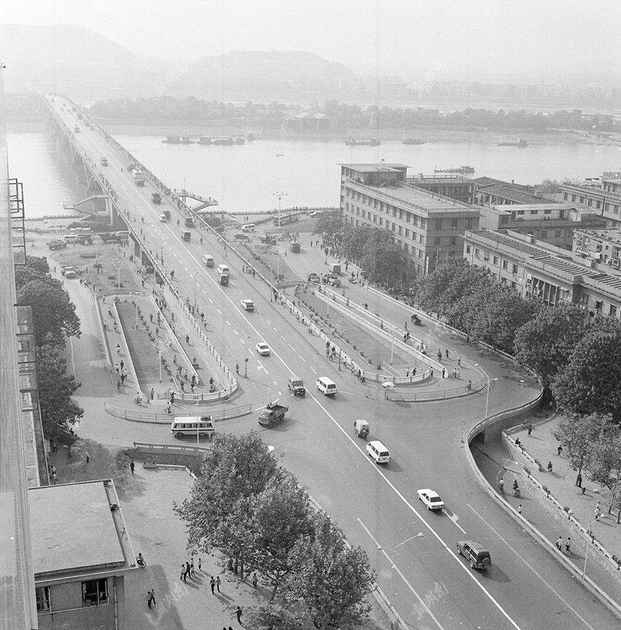 长沙湘江大桥人车稠密,桥东头过去道路单一,经常发生交通堵塞。1987年市政部门将湘江大桥桥东进行改点,实施机动车、非机动车和行人各行其道,车辆畅通无阻。图为1987年9月30日,湘江大桥桥东车道分流一瞥。陈金华 摄