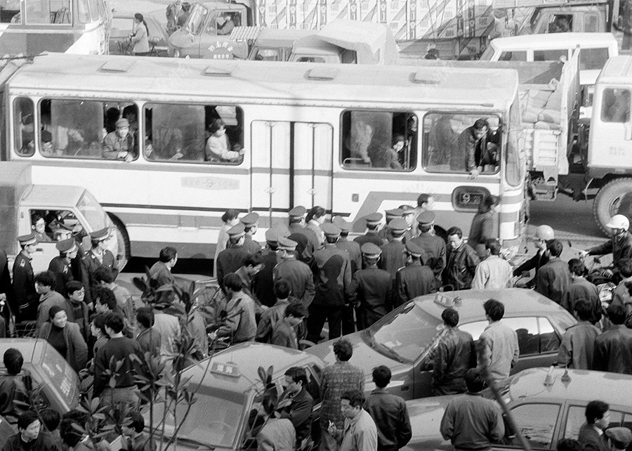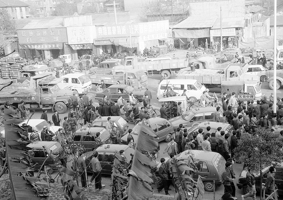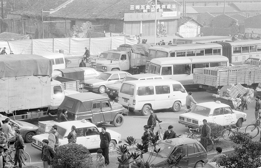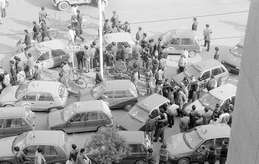 1993年12月10日,长沙芙蓉中路,“的士”集结、堵塞交通。湖南日报记者 谷一均 摄