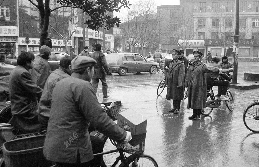 1995年1月1日,元旦,长沙工程兵学院,省警校的学生上街执勤。湖南日报记者 刘建光 摄