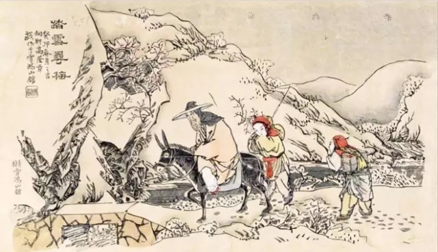 一老者骑驴在山中寻看梅花,童子与侍婢跟随。天降大雪,为寻梅添兴致。此画的线条似国画,是杨柳青年画的名作。