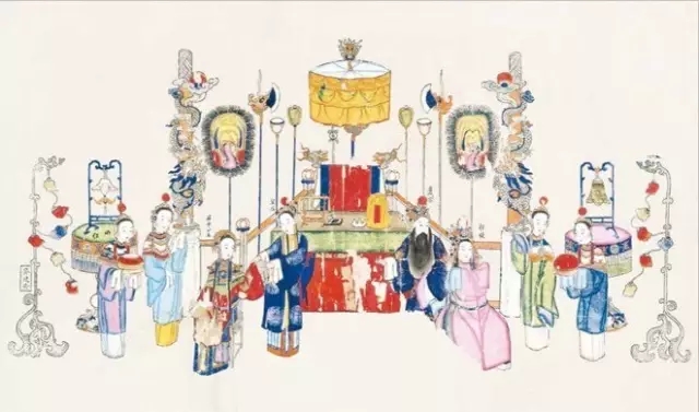 戏剧故事,画的是《打金枝》的场面:郭子仪寿辰,子郭瑷因妻升平公主拒不祝寿,怒而殴之。公主哭诉于唐代宗(李豫)。郭子仪知道后绑郭瑷上殿请罪,皇后为二人劝解和好,代宗升了郭瑷的官级,最后皆大欢喜。