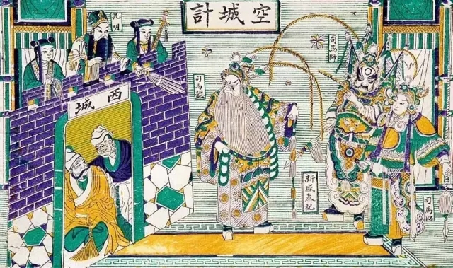 戏曲故事画:街亭失守后,诸葛亮所驻西城空虚。司马懿兵临城下,诸葛亮设空城计,令城门大开,老弱兵勇打扫街道,诸葛亮坐城头,抚琴饮酒以待。
