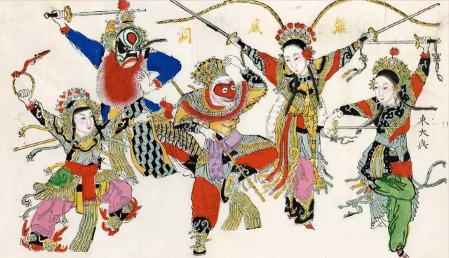 京剧曲目,又名《陷空山》,故事出自《西游记》,描写陷空山无底洞中的白鼠精,把唐僧抢到洞中,强逼唐僧成婚。孙悟空请李靖、哪吒下界,收伏了白鼠精。画中人物作舞台“亮相”的样子,十分生动。