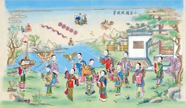 春暖花开,微风怡人,女孩子们竞相放飞风筝。图上的风筝现在看起来都很新奇。