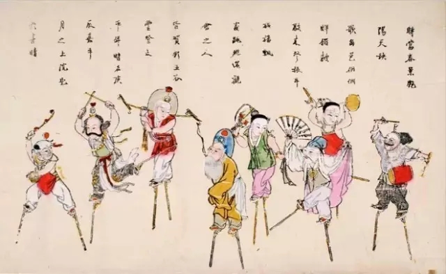 高跷会是民间花会,在年节描绘和丰收的时候演出,这幅画把高跷艺人换成儿童,妙趣横生。