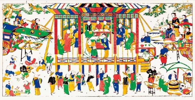 在杨家埠,人们在农历四月初八的庙会搭台唱戏,画上正在演出《三娘教子》,周围各村的村民套着马车纷纷赶来,看戏、饮酒、喝茶、下棋,十分富有生活情趣。