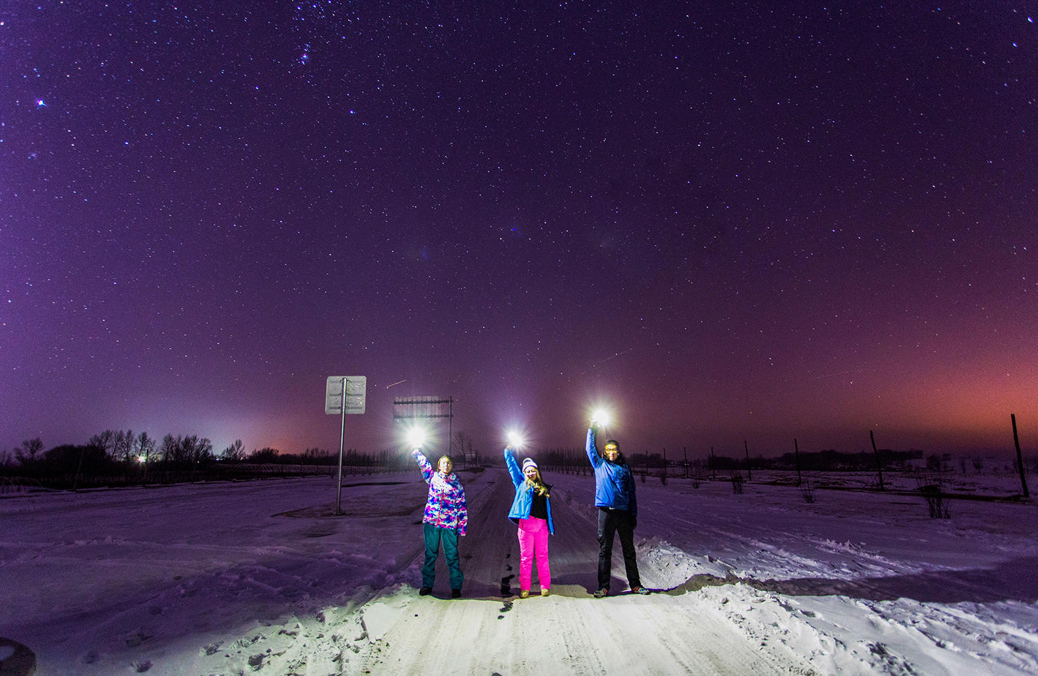 1月23日,吉林市长吉北线大红土。人们举起三盏灯光与天空的三星遥相呼应。摄影:李志。