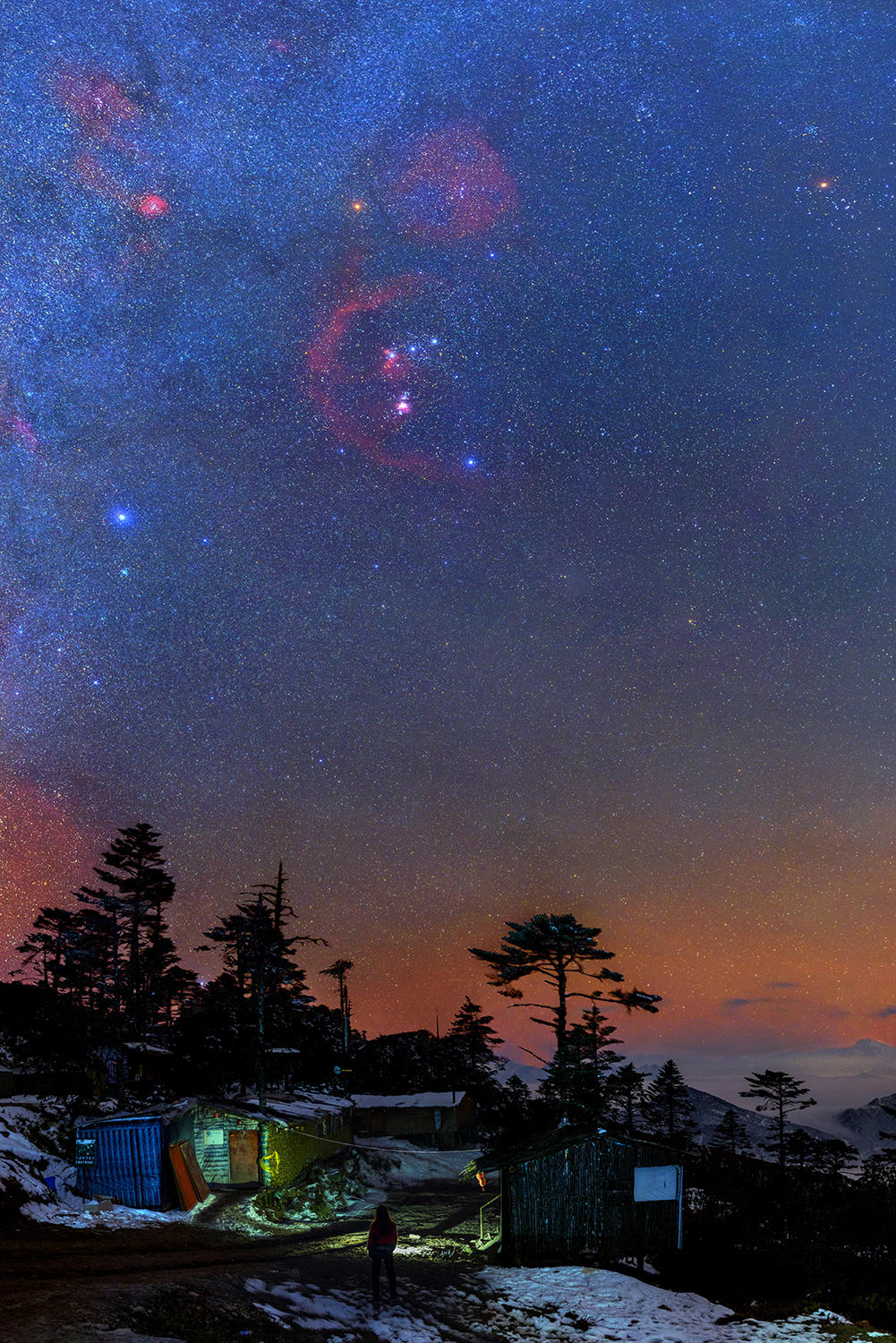 1月24日,猎户三星高挂在四人同山的夜空,地上和树屋被厚厚的积雪覆盖,仿佛进入了童话世界。摄影:王治才。