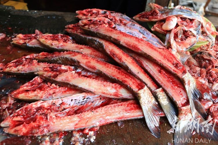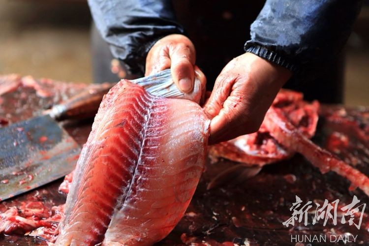尹师傅家的鱼丸,第一步就是选用3公斤以上、农家用青草喂养的泥塘草鱼,去鳞后剖开成两半,去掉内脏后备用。