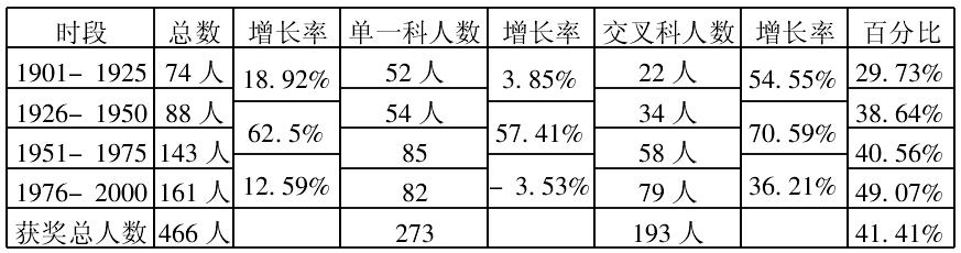 上表以25年为时段,分析比较具备交叉知识背景和单一知识背景的诺贝尔科学奖获得者的人数比率从1901年-1925年的70.27%缩小到了1976年-2000年的50.93%。可以从中看出,具备交叉知识背景的获奖者成呈稳步上升的趋势,表明科学认识主体(Science understanding main body)知识背景的交叉,对于促进