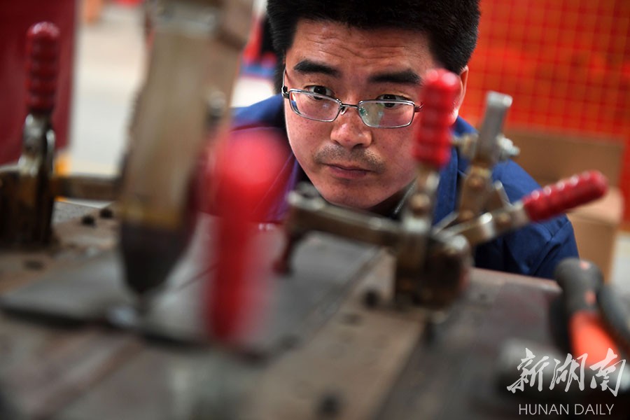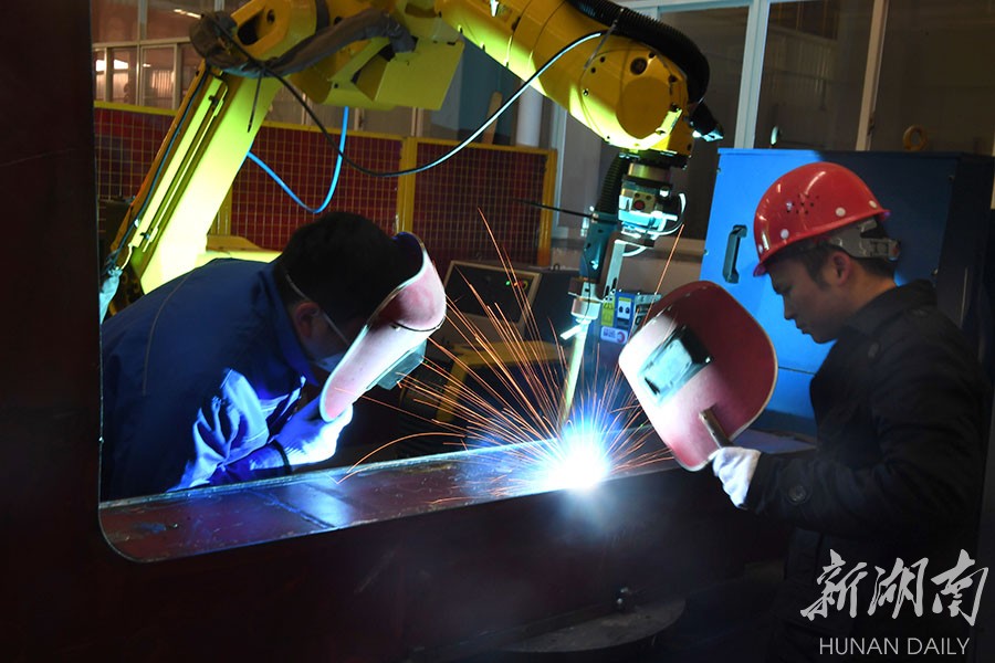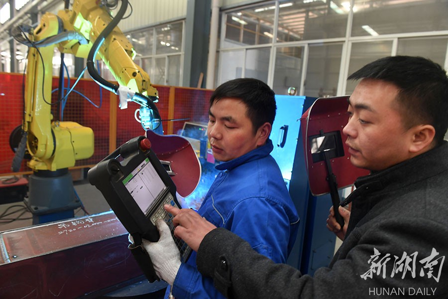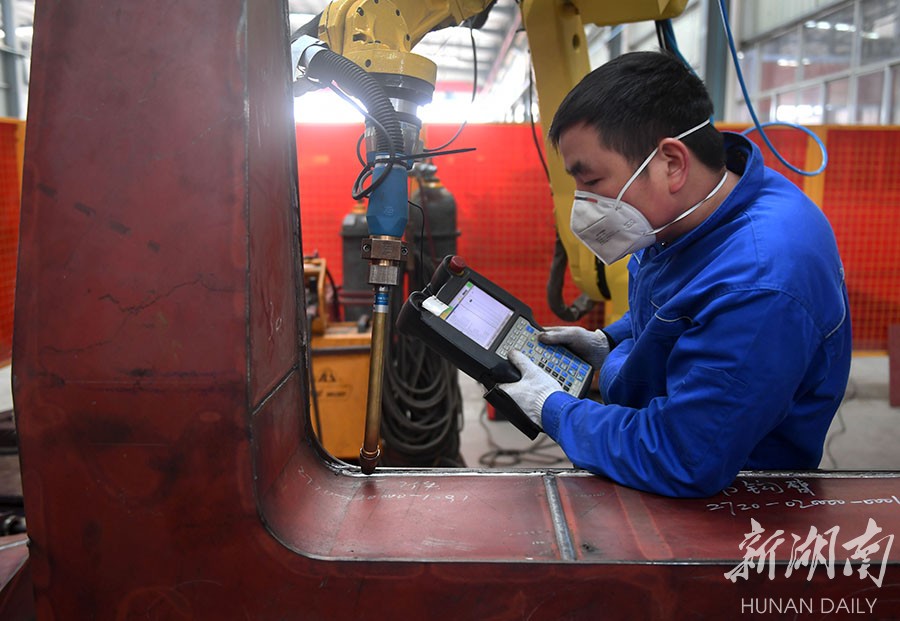 2月9日,湖南蓝天机器人科技有限公司,技术工人运用示教仪指挥等离子复合焊接机器人进行精细焊接。