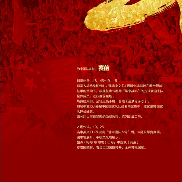 热身结束后,全场将点亮手机,合唱《追梦赤子心》。比赛开始前的球员入场仪式,现场中文DJ播报中国国家队队员名单过程中,球迷可跟喊国家队球员姓名。如果你是第一次进入足球场看球,也没关系,可以关注大屏幕呈现的助威教程,练习助威口号。