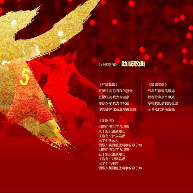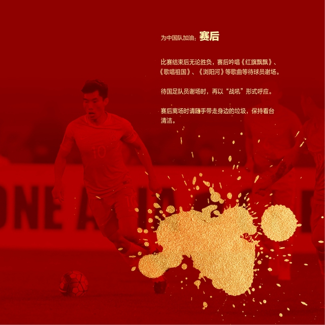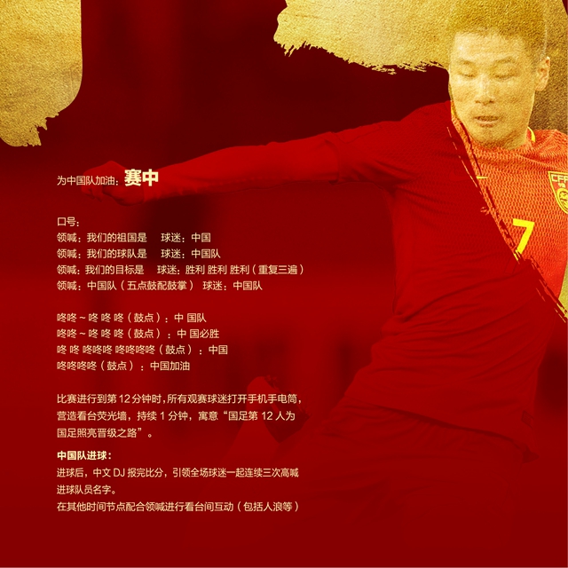 在现场,球迷除可以跟着喊口号,打开手机手电筒营造看台荧光墙,制造人浪外,一旦遇到中国队进球的情况,还可以待现场中文DJ报完比分后,跟着大家一起 高喊三次进球球员的名字。作为中国队的主场球迷,当然少不了通过各种助威方式来壮胆助威,而这次安排的为中国队加油助威歌曲共三首,分别是《红旗飘飘》、 《歌唱祖国》、《浏阳河》。赛后,无论胜负,现场都吟唱这三首歌曲等待球员谢场。待中国队球员离场时,再用“维京战吼”的方式形成首尾呼应。