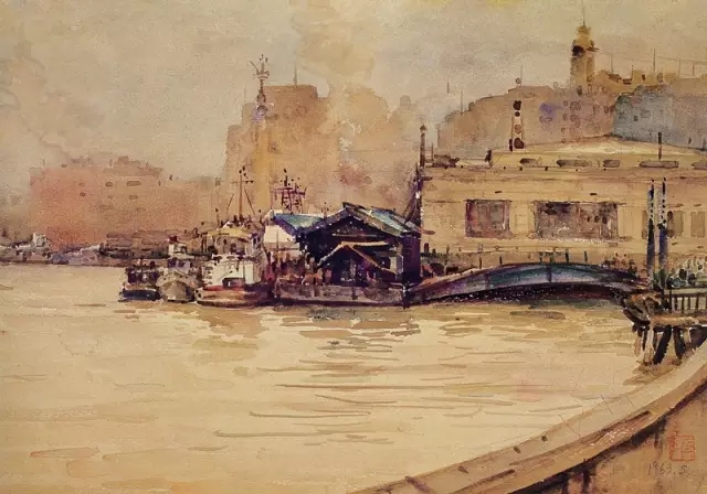 ▲上海外滩码头 水彩画 25cmx35.8cm 殷保康 1963年