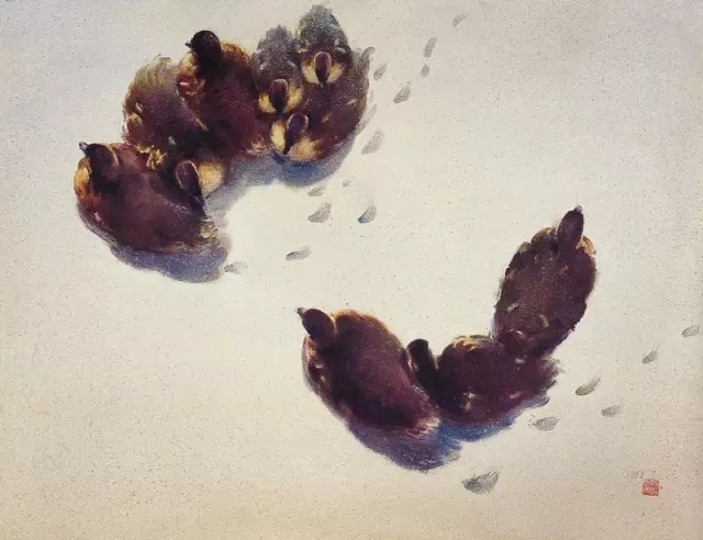 ▲雏鸭合暖 水彩画 59cmx76cm 殷保康 1989年