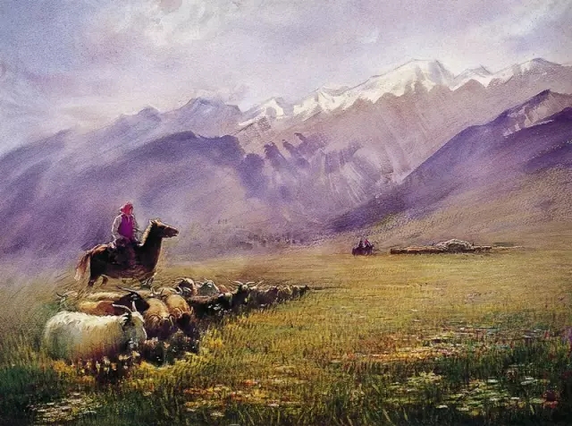 ▲风吹草地 水彩画 56cmx76cm 殷保康 1996年