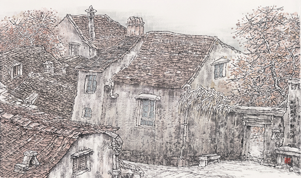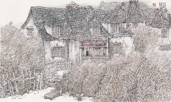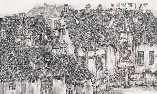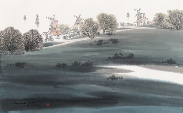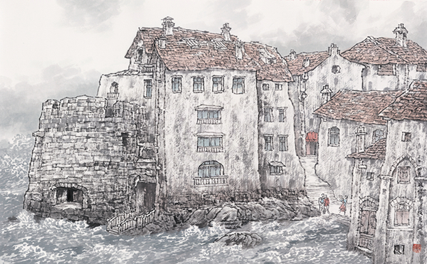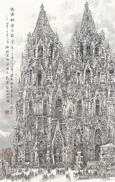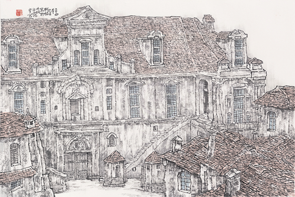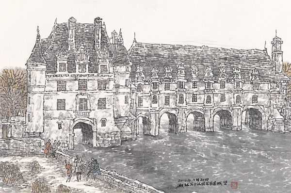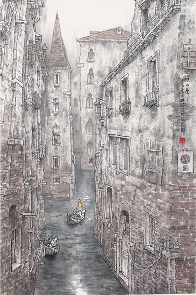 赵溅球于2014年7月、8月、10月、11月,两次游历欧洲写生,历时三个多月。写生抵达意大利、梵蒂岗、法国、比利时、荷兰、卢森堡、德国等国家,行程三干多公里,携带自己特制的中国画写生工具,现场创作水墨画写生六十余幅,速写作品百余幅,此次展览精选四十幅作品专场展出。