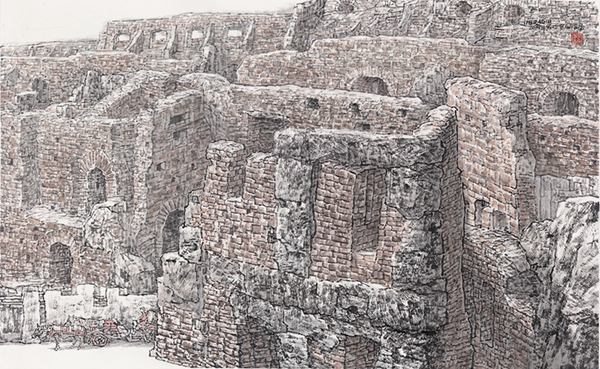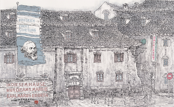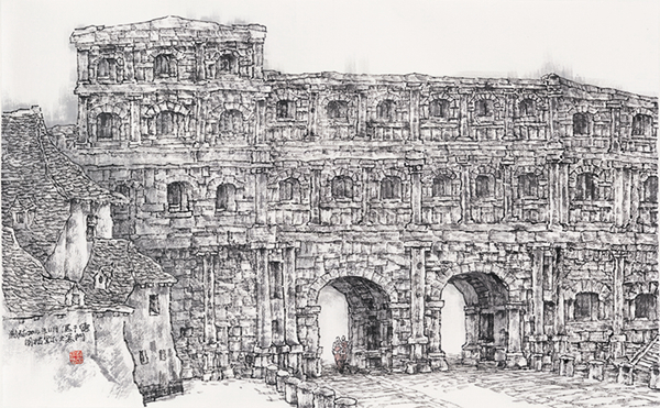 此次展览主要展出赵溅球欧洲建筑写生作品。这批作品力求在表现上抵达一种高度,在写生与再创作中试图扺达到一种理想境界,在中国画表现异国建筑上作了可贵的尝试。他在薄薄的宣纸上,用毛笔把欧洲建筑的厚重与质感表现得淋漓尽致,并将赵氏推理透视发挥到极致,把目不可及的空间作艺术化呈现,让画面既有美感,又合符建筑存在的合理性。如《特里尔大黑门》系青铜建筑,现场观众可以感受到建筑沉重的质感跃然纸上。