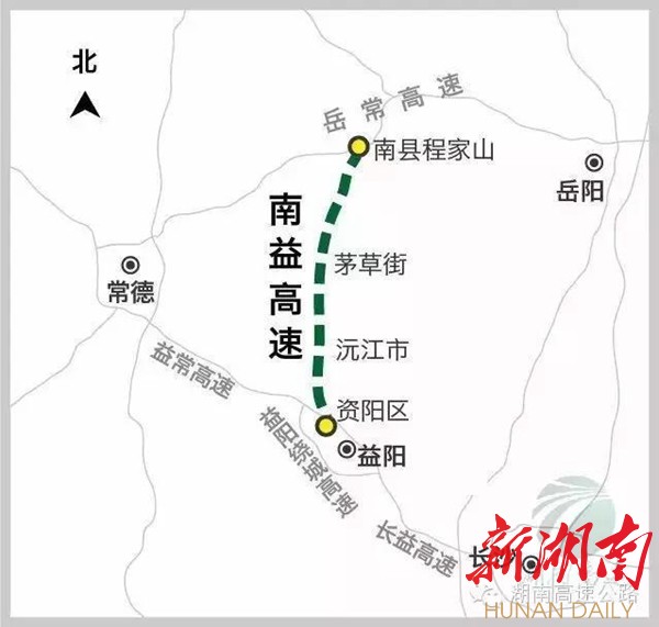 据了解,南县至益阳高速公路(简称“南益高速”),是湖南高速公路网规划南县至常宁高速公路中的北段。南北走向,起于南县程家山,接已建的岳阳至常德高速公路,往南经茅草街、沅江,止于益阳市资阳区,与已建的益阳至常德高速公路相接,并顺接益阳绕城高速公路,全长86.72公里。项目初步设计概算为79.97亿元,按双向四车道高速公路标准建设,设计速度为每小时100公里,预计2018年底建成通车。南益高速是我省第一条纵贯洞庭湖腹地的高速公路,对于完善全省高速公路路网结构,提高洞庭湖区防洪保障能力,开发洞庭湖旅游资源,促进区域经济发展意义重大。