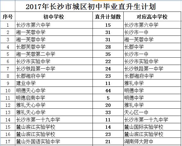 新湖南客户端4月27日讯(记者 姚学文)今天,长沙市教育局中招办下达了2017年长沙市城区初中毕业直升生计划,要求初中学校对符合直升资格且自愿选择对应高中学校的学生,根据初中三年在德、智、体、美等方面的综合测评结果,确定直升生拟定名单。