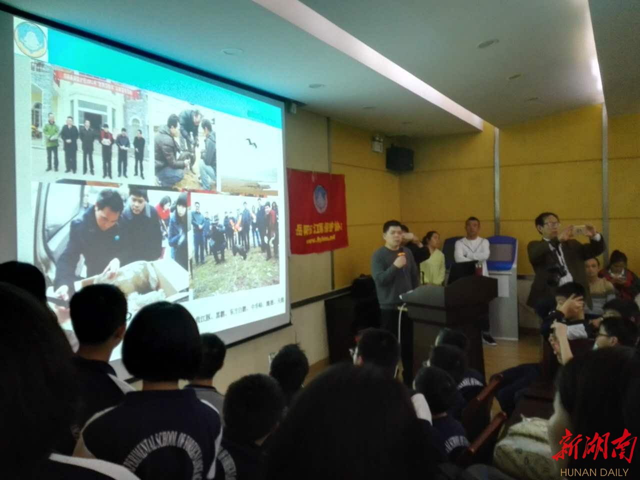 在母亲湖畔,来到知名公益活动“跟着大雁去迁徒”1号碑前,麓外学子齐声朗诵《鸟道宣齐》,表达了他们热爱母亲湖,保护湿地和候鸟的决心。在保护区宣教中心,师生们参观了标本展示馆,并听取了全国十大责任公民,岳阳市江豚协会会长徐亚平的《洞庭湖的美丽与忧伤》演讲。徐亚平以赤子之心,让同学们逐渐了解了一个前所未知的洞庭湖,演讲结束,同学们报以热烈的掌声,并踊跃为困难志愿者捐款。
