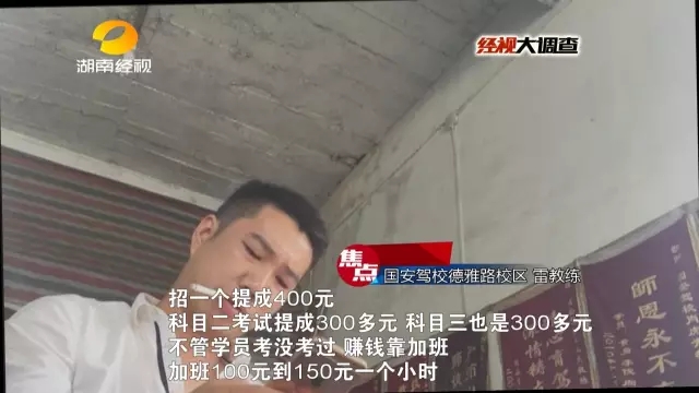 正如学员们所说,该校区一位雷姓教练告诉记者,主车教练捞钱的途径有二,招生与加班。
