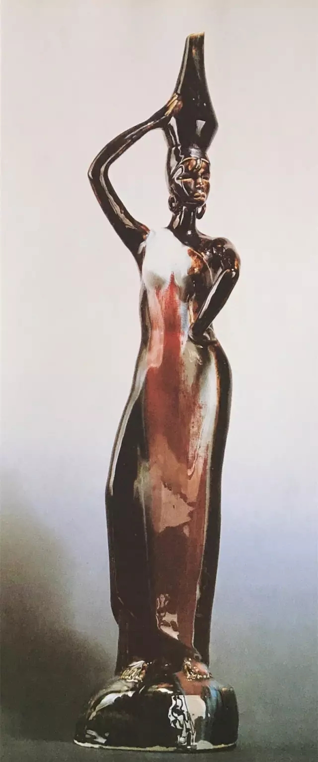 由于十年动乱的耽误而迟到的这第一个创作高峰期,正是他进入不惑之年思想趋于成熟的时候,这个时期的作品也因此进入了一个更高的境界,他的作品主要以动物为题材,这样既有利于充分发挥景德镇及全国各产区的特色高温颜色釉、窑变釉等及其纹理的效果,又便于借助动物的情态寄意造境,含蓄地展示社会的情态。这个时期在材料运用,尤其是色釉的运用方面几乎是集全国高温色铀之大成,已经达到得心应手,取舍自如的地步。造型造境多夸张变形,含而不露,留有广阔的联想空间,因而非常耐看。比如《天亮了》的深刻内涵,究竟是对粉碎“四人帮”,庆幸自己获得自由的欢呼,还是对中华民族从 “文革”灾难中解救出来获得光明的啼鸣,抑或是对人类期望美好未来的呼唤?这只有留给欣赏者自己去领悟。同样,《一场惊梦》、《本是同根生》、《贪得无厌》等许多作品,也没有忘却人间社会。他究竟表现什么?寓意什么?却又是很耐人揣摩玩味的。
