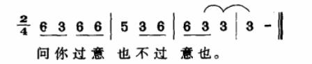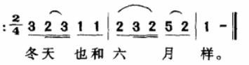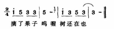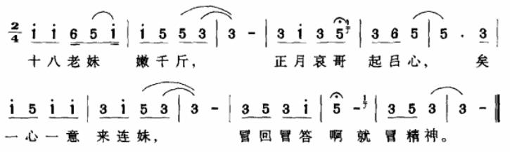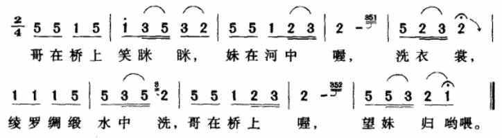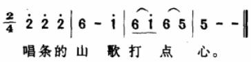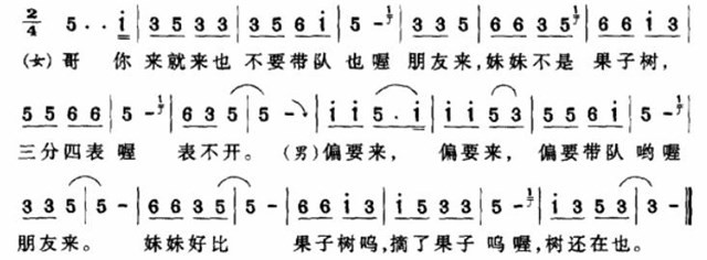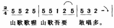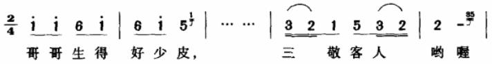 再如《砍柴歌》《哥哥生得好少皮》等也有少数方整性乐句结构的,如《豆腐歌》《你喊我唱歌我就唱》等。
