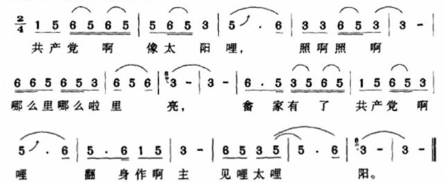 四度跳进则多出现在句中扩充部分的衬腔处,常以上挑的形态进行。如上例。闽浙地区的畲族山歌则是以连续的大六度纯五度进行为特质,如《共产党像太阳》: