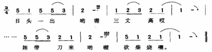汝城畲族山歌的宫调式音阶大多为:“1 2 3 5”四声音阶。如《砍柴歌》: