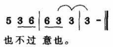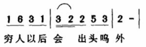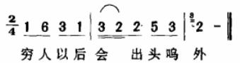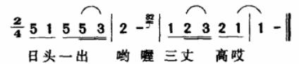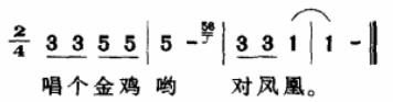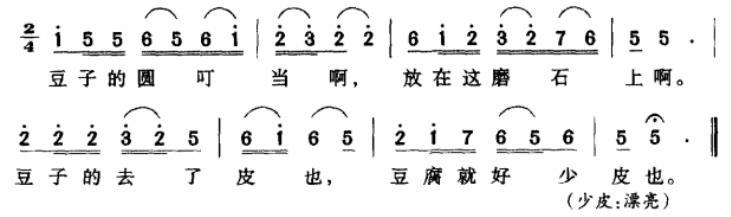 微调式音阶则主要为“5 6 1 2 3”,有少数曲调出现了五声音阶以外的“7”但它是出现在羽柏弱位或短时值得偏音。如《豆腐歌》: