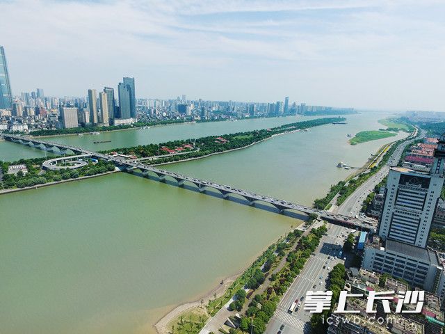 航拍长沙橘子洲附近湘江沿岸主城区。