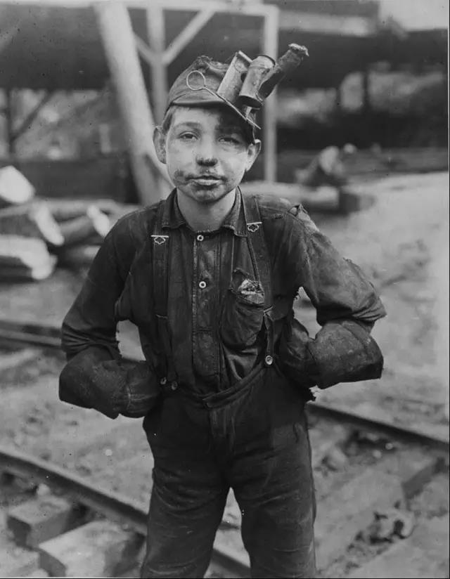 在窄小而危险的工作环境中,海因用藏在饭盒里的相机,不动声色地把他们拍摄下来。拍摄时,他尽可能简化背景,突出主体,并使人物表情与残酷的环境形成鲜明对比。